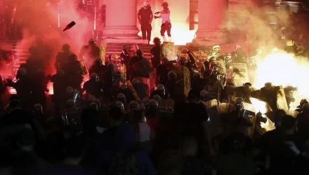 Νεαροί εθνικιστές ξεπέρασαν χιλιάδες άλλους διαδηλωτές, που εναντιώνονται στη βία, έκαναν πέρα τα μεταλλικά κιγκλιδώματα κι εξαπέλυσαν έφοδο στην αφύλακτη κεντρική είσοδο της σερβικής Βουλής, στο κέντρο του Βελιγραδίου. Αστυνομικοί που βρίσκονταν μέσα στο κτίριο τους απώθησαν, προτού στήσουν περίμετρο ασφαλείας μπροστά σε αυτό.
