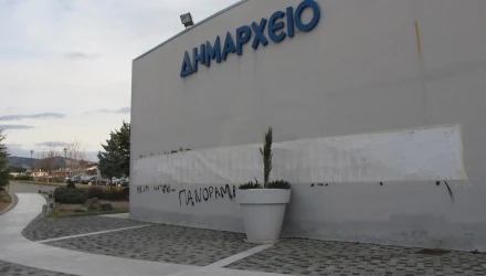 Πιο συγκεκριμένα τις πρώτες πρωινές ώρες, όπως αναφέρουν οι πληροφορίες στις 5:30, ο φύλακας του δημαρχείου αντιλήφθηκε δύο άτομα να γράφουν συνθήματα κατά της ΕΕΑ (Επιτροπή Επαγγελματικού Αθλητισμού).