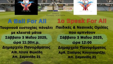 Ο Δήμος Πυλαίας Χορτιάτη, η Περιφερειακή Ένωση Δήμων Κεντρικής Μακεδονίας και το Όραμα Νέων Youthorama διοργανώνουν το 1ο «Speak for all» στο Πολιτιστικό Κέντρο Πανοράματος του Δήμου Πυλαίας-Χορτιάτη. Η πρώτη μαζική δράση του φορέα για το 2025 θα υλοποιηθεί το Σάββατο 3 Μαΐου στις 12:00 στο Πολιτιστικό Κέντρο Πανοράματος.