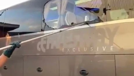Οι «μερένγκες» βρίσκονταν καθ' οδόν για το γήπεδο, στους γύρω δρόμους υπήρχε κόσμος και δυστυχώς μια μερίδα από αυτούς πέταξε αντικείμενα και προκάλεσε φθορές στο πούλμαν της ομάδας.