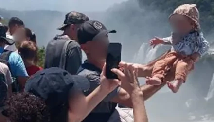 Το απίστευτο περιστατικό σημειώθηκε στο Εθνικό Πάρκο Ιγκουασού, στα σύνορα Βραζιλίας και Αργεντινής, όταν ο άνδρας εμφανίστηκε να κρατά το βρέφος του έξω από τα προστατευτικά κιγκλιδώματα, μπροστά από τον καταρράκτη Garganta del Diablo ύψους 80 μέτρων, για να το φωτογραφίσει.