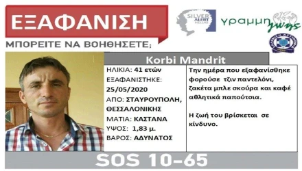 Χάθηκε από την περασμένη Δευτέρα (25/5), από την περιοχή της Σταυρούπολης, ο Korbi Mandrit. Είναι 41 ετών, αδύνατος, έχει καστανά μάτια και ύψος 1,83. Την ημέρα που εξαφανίστηκε φορούσε τζιν παντελόνι, σκούρη μπλε ζακέτα και καφέ αθλητικά παπούτσια.