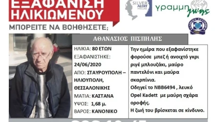Πρόκειται για τον Αθανάσιο Πισπηλή ηλικίας 80 ετών, ο οποίος εξαφανίστηκε. Την ημέρα που χάθηκε φορούσε μπεζ ή ανοιχτό γκρι ριγέ μπλουζάκι, μαύρο παντελόνι και μαύρα σκαρπίνια.