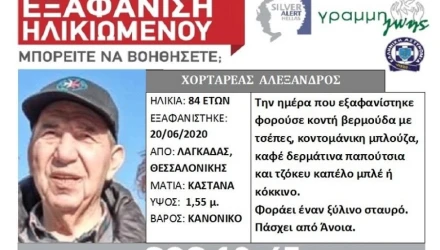 Σύμφωνα με ανακοίνωση που εξέδωσε η "Γραμμή Ζωής", πρόκειται για τον 84χρονο Αλέξανδρο Χορταρέα, τα ίχνη του οποίου χάθηκαν χθες από τον Λαγκαδά.