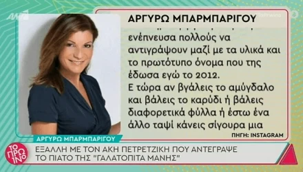 Η Αργυρώ Μπαρμπαρίγου είναι έξαλλη με τον Άκη Πετρετζίκη, γιατί θεωρεί ότι αντέγραψε το πιάτο της «Γαλατόπιτα Μάνης»...