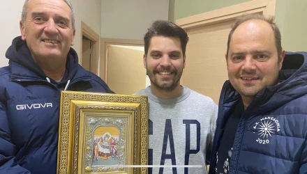 Με μια αγιορείτικη εικόνα από το περιβόλι της Παναγίας ο πρόεδρος και ο γενικός αρχηγός της Μακεδονίας Ευκαρπίας Γιώργος Κίκης και Σ. Κόκκινος