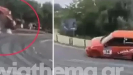 Κατά τη διάρκεια της πορείας του και μετά από στροφή ανατράπηκε με σφοδρότητα, έπεσε πάνω στις προστατευτικές μπάρες και κατέληξε στη μέση του δρόμου.