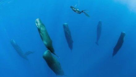 Ο Ελβετός φωτογράφος της άγριας ζωής Franco Banfi και μια ομάδα δυτών παρακολουθούσαν μια ομάδα φαλαινών-φυσητήρων στην Καραϊβική Θάλασσα, όταν ξαφνικά τα εν λόγω κήτη ακινητοποιήθηκαν και έπεσαν σε κατακόρυφο ύπνο!