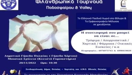 Με αφορμή τον εορτασμό της «Παγκόσμιας Ημέρας Παιδιού» ο Αθλητικός Μορφωτικός Όμιλος «ΕΘΝΙΚΟΣ ΠΥΛΑΙΑΣ» θα πραγματοποιήσει στις 20 Νοεμβρίου 2022 και ώρα 10:30πμ έως 14:00μμ στο Δημοτικό Γήπεδο Πυλαίας «Δ.Α.Κ. Πυλαίας» εκδήλωση φιλανθρωπικού σκοπού, με τη συμμετοχή και άλλων αθλητικών σωματείων.