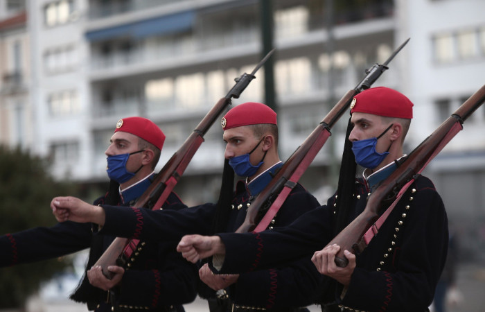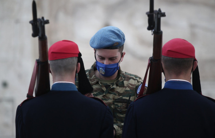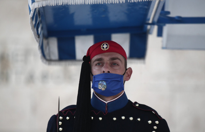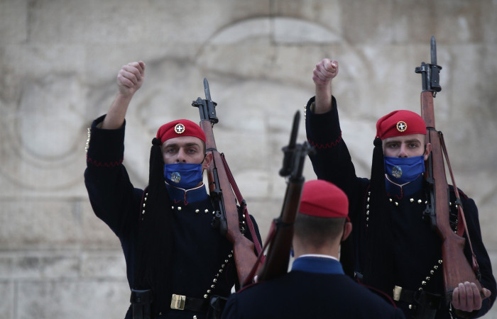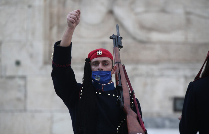 Μια πρωτόγνωρη εικόνα είδαν οι Αθηναίοι στο μνημείο του Αγνώστου Στρατιώτη στο Σύνταγμα, με τους εύζωνες της Προεδρικής Φρουράς να φορούν… προστατευτικές μάσκες!