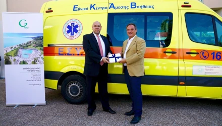 Στα κεντρικά γραφεία του Παραρτήματος του ΕΚΑΒ στην Πυλαία Θεσσαλονίκης, ο Διευθύνων Σύμβουλος των GHotels, κ. Νίκος Γρηγοριάδης, παρέδωσε στον κ. Νίκο Παπαευσταθίου 300 voucher διακοπών, τα οποία θα δώσουν ανάσα ξεκούρασης και χαλάρωσης στους εργαζόμενους, στη μοναδική εμπειρία φιλοξενίας των GHotels στη Χαλκιδική.