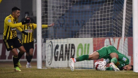 Γι΄αυτή τη φάση διαμαρτύρεται ο Άρης πως η μπάλα πέρασε τη γραμμή και δεν μέτρησε γκολ