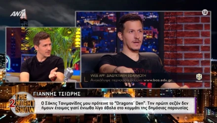 Καλεσμένος στο The 2Night Show ήταν τα μεσάνυχτα της Τετάρτης (14/5) ο Γιάννης Τσιώρης. Ο νεαρός επιχειρηματίας, που φέτος συμμετέχει στον νέο κύκλο του Dragon’s Den, περιγράφει πώς έφτασε να δημιουργήσει τη δική του start-up εταιρεία, που εξαγοράστηκε έναντι 360 εκατομμυρίων δολαρίων.