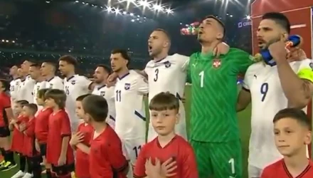 Παρά την εχθρική ατμόσφαιρα, οι διεθνείς της Σερβίας τραγούδησαν με ένταση τον εθνικό ύμνο στο κέντρο του γηπέδου, δείχνοντας αποφασισμένοι να σταθούν στο ύψος των περιστάσεων.