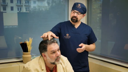 Αντίθετα, ο φίλος του ακολουθεί μια πιο άμεση και οριστική λύση: τη μεταμόσχευση μαλλιών.