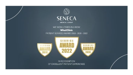 Η Seneca Medical Group, μια από τις πλέον καινοτόμες κλινικές για την αντιμετώπιση της τριχόπτωσης της Ευρώπης, κέρδισε ακόμα δύο WhatClinic Patient Service Awards 2022, για τις κλινικές της Θεσσαλονίκης και της Αθήνας! Η εταιρεία δεν είναι η πρώτη φορά που κατακτά τη συγκεκριμένη βράβευση, καθώς ήταν νικήτρια το 2018 και το 2020 αντίστοιχα.
