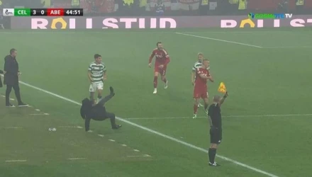 Χωρίς να υπάρχει... λόγος, ο προπονητής της Σέλτικ κλώτσησε την μπάλα στον αγωνιστικό χώρο, ωστόσο, λόγω και της βροχής, ο Ρότζερς γλίστρησε και έπεσε κάτω.
