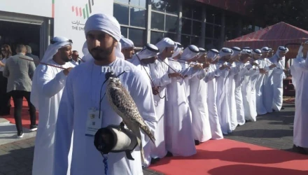 Πριν από λίγο στην είσοδο του περιπτέρου των Ηνωμένων Αραβικών Εμιράτων, άντρες χόρεψαν τον παραδοσιακό χορό “Ελ ράσφα” τραγουδώντας και καλωσορίζοντας τους επισκέπτες της Έκθεσης.