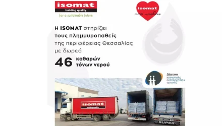 Η ISOMAT, ως μία κοινωνικά ευαισθητοποιημένη εταιρεία, στέκεται στο πλευρό των κατοίκων της Θεσσαλίας, που βιώσαν τις καταστροφικές συνέπειες της κακοκαιρίας Daniel και αντιμετωπίζουν σοβαρή έλλειψη πόσιμου νερού, προσφέροντας 46 τόνους εμφιαλωμένου νερού.