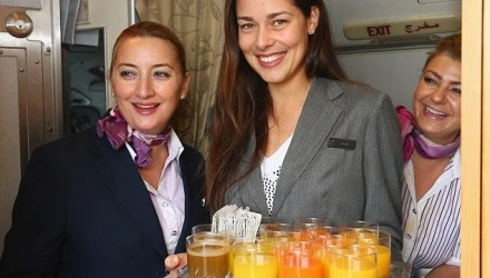 Η Άνα Ιβάνοβιτς κατά τη διάρκεια της πτήσης προς την Σιγκαμπούρη σερβίρει ροφήματα της αρεσκείας τους σε Σερένα Γουίλιαμς (αριστερά) και Ντανιέλα Χαντούκοβα (δεξιά).