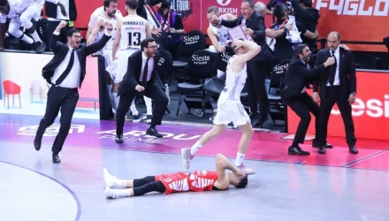 Ο Ολυμπιακός έχασε στο τελευταίο σου το τρόπαιο και ο έμπειρος άσος του φαίνεται πεσμένος στο παρκέ να πιάνει το κεφάλι του μετά και το δικό του άστοχο σουτ στην εκπνοή ενώ στο βάθος διακρίνεται ο Σέρχιο Γιουλ, που δευτερόλεπτα πριν είχε πετύχει το νικητήριο καλάθι για τη Ρεάλ, να ξεσπά σε πανηγυρισμούς.