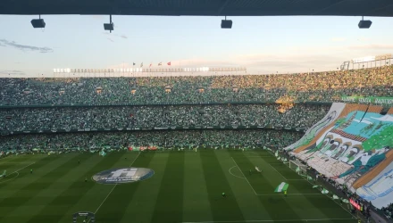 Πριν την έναρξη του αγώνα, αυτό που μου έκανε εντύπωση ήταν η ατμόσφαιρα που δημιούργησαν οι «μπέτικος». Τραγουδώντας τον ύμνο της ομάδας και βιντεοσκοπώντας την ατμόσφαιρα, παρατήρησα κάτι που δεν είχα ξαναδεί σε ποδοσφαιρικό γήπεδο. Τα μάτριξ του γηπέδου έγραφαν τους στίχους του ύμνου ενώ δίπλα ακριβώς υπήρχε και ο ύμνος στη νοηματική! Τρομερή κίνηση από την Μπέτις. Το γήπεδο δονείτο καθώς σχεδόν 55.570 θεατές τραγουδούσαν όρθιοι. Το κορεό που υπήρχε στη θύρα των φανατικών της Σεβίλλης ήταν εντυπωσιακό.