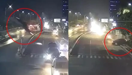 Βίντεο δείχνει τη στιγμή που το πολυτελές αυτοκίνητο εκσφενδονίστηκε από την ημιτελή αερογέφυρα και έπεσε στον δρόμο. Για καλή τύχη του οδηγού, η BMW προσγειώθηκε με τον προφυλακτήρα τη στιγμή που μόλις είχαν απομακρυνθεί δύο αυτοκίνητα και μία μοτοσικλέτα.