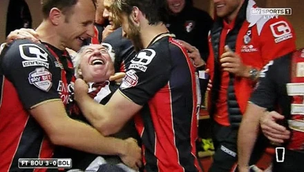 Μεθυσμένη πολιτεία θυμίζει από το βράδυ της Δευτέρας (27/4), η ομάδα της Μπόρνμουθ, η οποία μετά το 3-0 επί της Μπόλτον πανηγυρίζει την άνοδό της στα σαλόνια της Πρέμιερ Λιγκ.