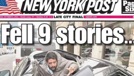 O 31χρονος άνδρας, σύμφωνα με τη New York Post, φέρεται να πήδηξε από ένα ανοιχτό παράθυρο στον ένατο όροφο. Ο 31χρονος έσκασε στην οροφή ενός αυτοκινήτου που ήταν σταθμευμένο κάτω από το πολυόροφο κτίριο και στη συνέχεια σηκώθηκε με το δεξί του χέρι να κρέμεται στο πλάι, ρώτησε χαμένος: "Τι συνέβη;".