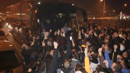 Οπαδοί της ΑΕΚ περίμεναν την αποστολή της ομάδας στη Λάρισα, ενόψει του πρώτου ημιτελικού με την ΑΕΛ, ζητώντας από τους παίκτες και τον Χιμένεθ το νταμπλ.