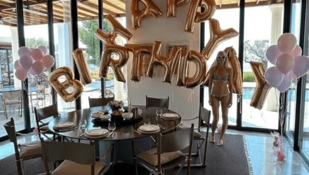 Για γλυκό επέλεξε αντί για τούρτα ένα κέικ με πλούσια επικάλυψη σοκολάτας. Στη λεζάντα γράφει: «Γιορτάζοντας σε ελληνικό παράδεισο, με μια ξεχωριστή φίλη που ήρθε να μου ευχηθεί για τα γενέθλιά μου [μάλλον αναφέρεται στην πεταλούδα]».