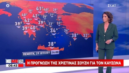 Πολύ υψηλές θερμοκρασίες αναμένονται από σήμερα Πέμπτη. Σύμφωνα με την μετεωρολόγο του ΣΚΑΪ, Χριστίνα Σούζη οι πολύ υψηλές θερμοκρασίες φαίνεται ότι θα κρατήσουν τουλάχιστον μέχρι τα μέσα της άλλης εβδομάδας. Από το Σαββατοκύριακο η θερμοκρασία στα Ηπειρωτικά θα φτάσει τους 42 με 44 βαθμούς.