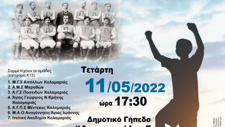 Νεαροί ποδοσφαιριστές, ετών 13, από εφτά Αθλητικές Ακαδημίες της Καλαμαριάς, θα συμμετάσχουν στο Ποδοσφαιρικό Τουρνουά Μνήμης, που διοργανώνει ο Δήμος Καλαμαριάς, στο πλαίσιο του προγράμματος εκδηλώσεων «Καλαμαριά 1922-2022 Μια θάλασσα μνήμες… και γινήκαμε όλοι ένα».