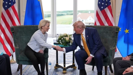 Ο Αμερικανός πρόεδρος ανακοίνωσε «τη μεγαλύτερη εμπορική συμφωνία» που έχει επιτευχθεί ποτέ, μεταξύ των ΗΠΑ και της Ευρωπαϊκής Ένωσης, κατά τις συνομιλίες που είχε σήμερα στο Τέρνμπερι της Σκωτίας με την πρόεδρο της Ευρωπαϊκής Επιτροπής Ούρσουλα φον ντερ Λάιεν.