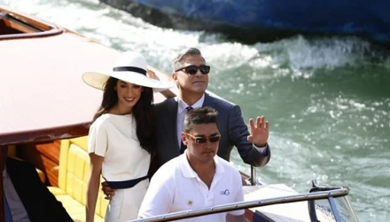 Το δημοφιλές ζευγάρι και αυτή τη φορά ήταν υπέροχο. Ο 53χρονος Αμερικανός ηθοποιός φόρεσε ένα πανάκριβο κοστούμι ενώ η 36χρονη δικηγόρος εντυπωσίασε φορώντας ένα ψηλόμεσο λευκό παντελόνι, με λευκό τοπ και ένα μεγάλο καπέλο. Το ζευγάρι έφτασε στο Δημαρχείο με τη βάρκα Amore.