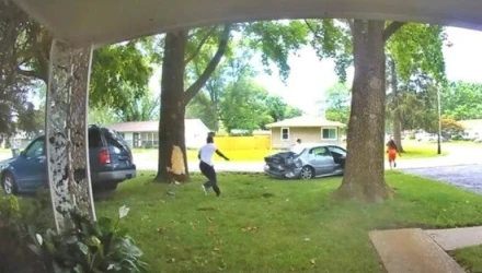 Από το video φαίνεται πως το πρωί στις 30 Ιουνίου, τα δύο αυτοκίνητα «συναντήθηκαν» σε μια διασταύρωση. Το μπλε Ford Explorer που ακολουθεί ένα ασημί Buick sedan, πέφτει με αρκετή φόρα πάνω του και το στέλνει σε παρακείμενο παρτέρι, για να καταλήξει και αυτό με τη σειρά του εκεί, αφού πέρασε μια βόλτα –αφήνοντας κάποια κομμάτια του- από ένα δέντρο.