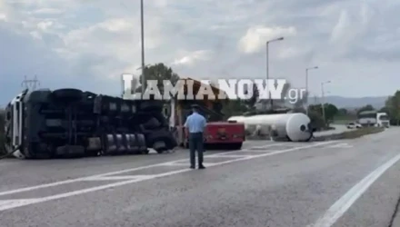 Κλειστή η Εθνική Οδός Αθηνών - Λαμίας μετά από ανατροπή βυτιοφόρου με υγραέριο