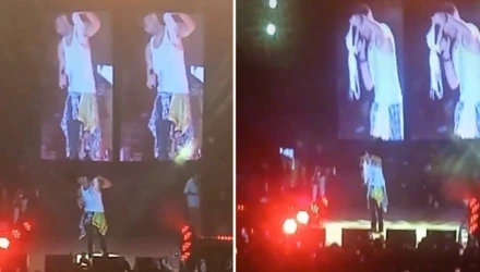 Μάλιστα, όπως φαίνεται και στο βίντεο, ο τραγουδιστής συνέχισε ανενόχλητος την ερμηνεία του, σαν να μη συνέβη τίποτα, κρατώντας το σουτιέν στο χέρι του.