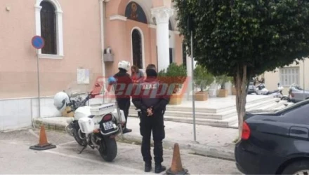 Αστυνομικές δυνάμεις συγκεντρώθηκαν το πρωί της Κυριακής (5/4) έξω από την εκκλησία Αγία Τριάδα στην Πάτρα.
