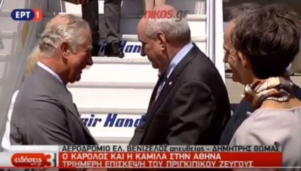 Τον πρίγκιπα Κάρολο και τη σύζυγό του Καμίλα υποδέχθηκε στο Ελευθέριος Βενιζέλος, μαζί με άλλη μέλη της ελληνικής αντιπροσωπείας, ο Τέρενς Κουίκ.