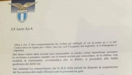 Ο Κλαούντιο Λοτίτο είχε δηλώσει τότε ότι οι υπεύθυνοι έχουν ταυτοποιηθεί και θα τιμωρηθούν. Ο πρόεδρος της Λάτσιο το είπε και, όπως φαίνεται από την επιστολή, το κάνει κιόλας!