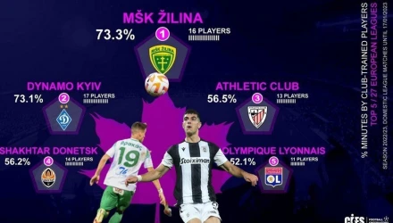 Τα υψηλότερα ποσοστά μετρήθηκαν για τους Σλοβάκους της Ζίλινα (73,3% των λεπτών από 16 προπονημένους παίκτες), δεύτερη είναι η Ντιναμό Κιέβου με 73,1% και 17 προπονημένους παίκτες, ενώ το βάθρο κλείνει η Αθλέτικ Μπιλμπάο (56,6% με 13).