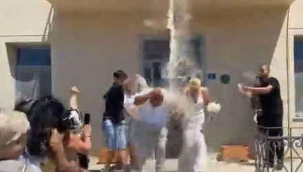 Σύμφωνα με το limnoslive, ο συγκεκριμένος γάμος δεν υπήρχε περίπτωση να μην έχει πλάκες. Η παρέα του γαμπρού του την είχε... στημένη και όταν οι νεόνυμφοι βγήκαν από το δημαρχείο, έγινε «μακελειό».