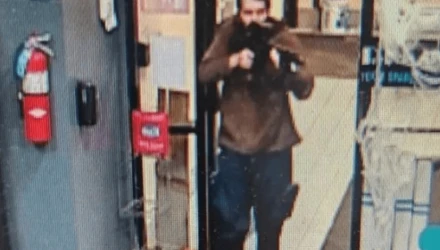 Φωτογραφία που εξέδωσε η αστυνομία δείχνει έναν λευκό άνδρα με ένα τουφέκι τύπου AR-15 και ένα οπτικό λέιζερ να εισέρχεται στο κέντρο αναψυχής Sparetime, φορώντας μαύρο στρατιωτικό παντελόνι και καφέ μπλούζα. Το πρόσωπό του φαίνεται καθαρά.