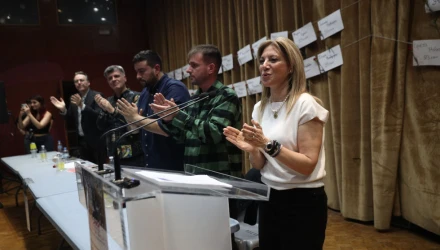 Οι παρευρισκόμενοι χειροκρότησαν όρθιοι την κα Καρυστιανού, φωνάζοντας παράλληλα συνθήματα υπέρ της δικαίωσης των θυμάτων του δυστυχήματος.