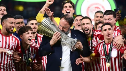 Συγκινημένος εμφανίστηκε ο Βαγγέλης Μαρινάκης μετά την κατάκτηση του τροπαίου του Conference League από τον Ολυμπιακό.