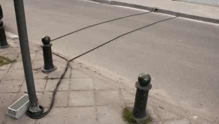 Πρόκειται για δύο εγκάρσια τοποθετημένα καλώδια που αποτελούν τμήμα μιας συσκευής μέτρησης κυκλοφοριακού φόρτου, έτερο κομμάτι της οποίας είναι ένα μπλε κουτί, στην άκρη του δρόμου.