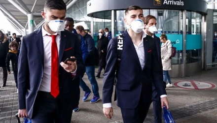 Οι ποδοσφαιριστές των «ερυθρόλευκων» προσγειώθηκαν στο Λονδίνο φορώντας εδικές μάσκες υπό τον φόβο του κορoναϊού που έχει θέσει σε "καραντίνα" ολόκληρη την Ευρώπη. Δείτε παρακάτω φωτογραφικό υλικό από την άφιξη των Πειραιωτών στο Λονδίνο.