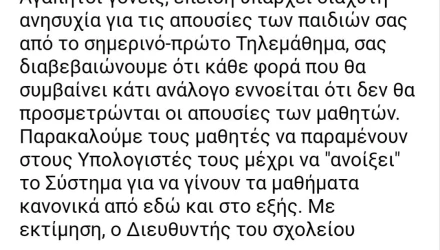 «Σας διαβεβαιώνουμε ότι κάθε φορά που θα συμβαίνει κάτι ανάλογο, εννοείται ότι δεν θα προσμετρώνται οι απουσίες των μαθητών», γράφει, μεταξύ άλλων, το μήνυμα, το οποίο προτρέπει τους μαθητές να βρίσκονται συνεχώς πάνω από τους υπολογιστές τους ώστε μόλις είναι έτοιμο το σύστημα να μπούνε αμέσως για μάθημα.