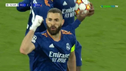 Ο Μπενζεμά με καταπληκτικό πλασέ στην κίνηση μετά από σέντρα του Μεντί, έγραψε το 2-1 και έβαλε ξανά τη Ρεάλ στο παιχνίδι.